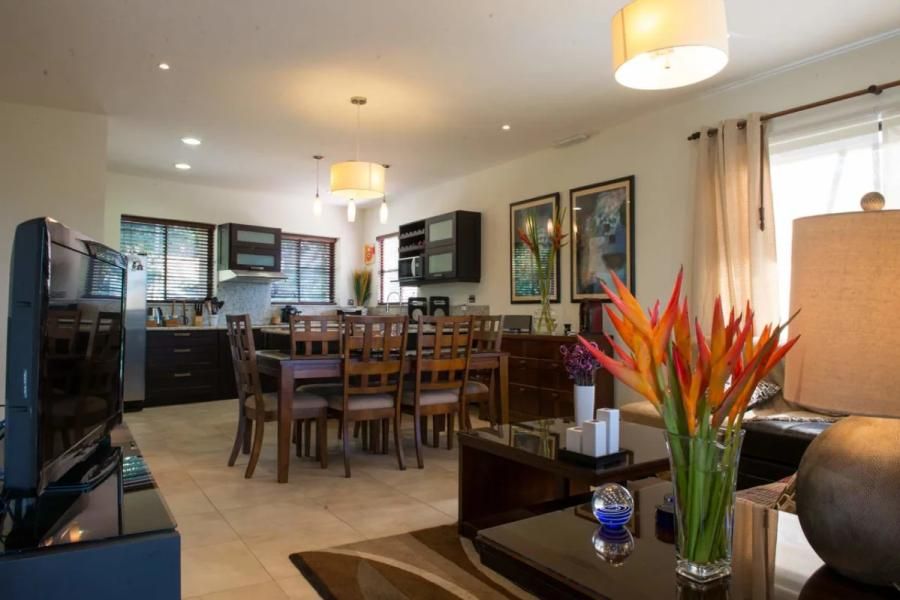 Cuenta con seguridad 24 horas, línea blanca, tres habitaciones, la tercera se puede usar también como oficina, cuenta col sala comedor integrado, cocina amplia con todos los electrodomésticos, terraza con vista al atardecer, baño de visitas, habitación principal con baño propio y tina, habitación secundaria con baño completo, cuarto de lavandería y parqueo bajo techo.